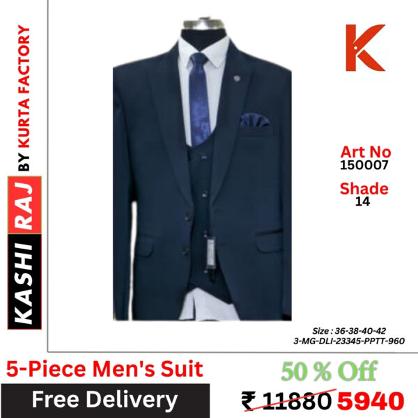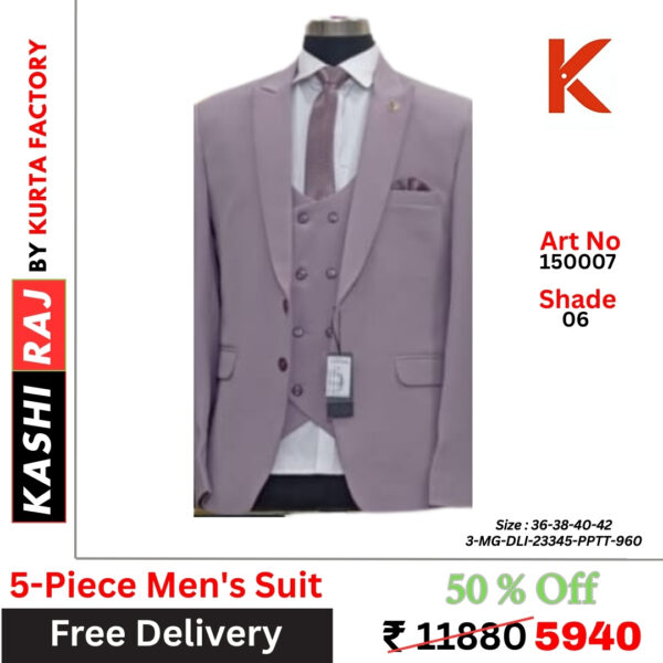 Expertly crafted for a structured yet comfortable fit, this 5-piece suit set blends modern tailoring with traditional elegance. The blazer features a clean, contoured silhouette with notched lapels and a two-button closure, while the vest adds an extra layer of polish and style. The trousers are designed with a flattering cut to offer both comfort and sleek appearance.