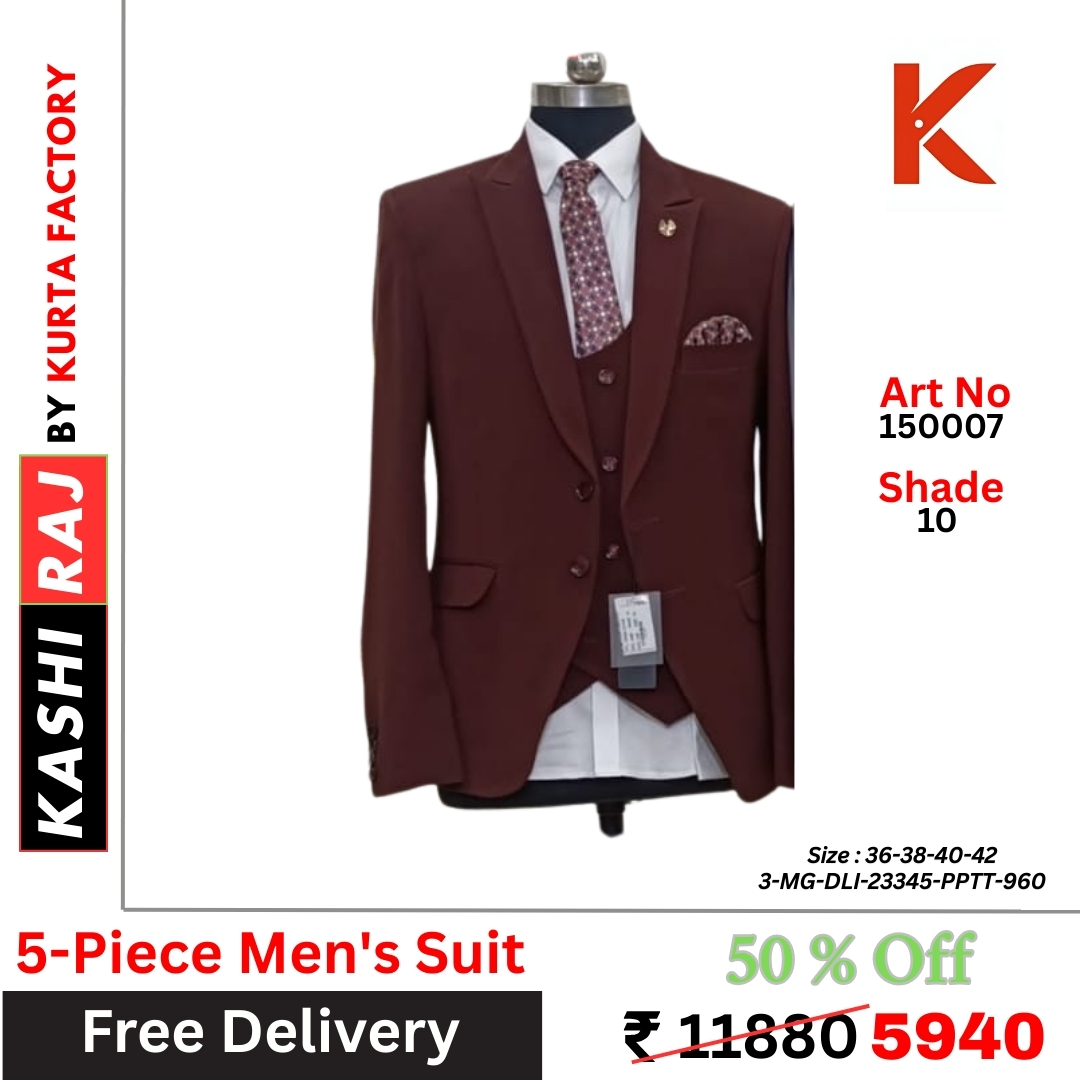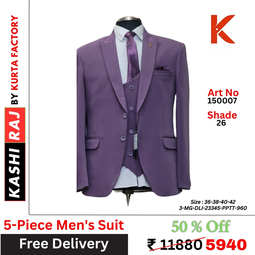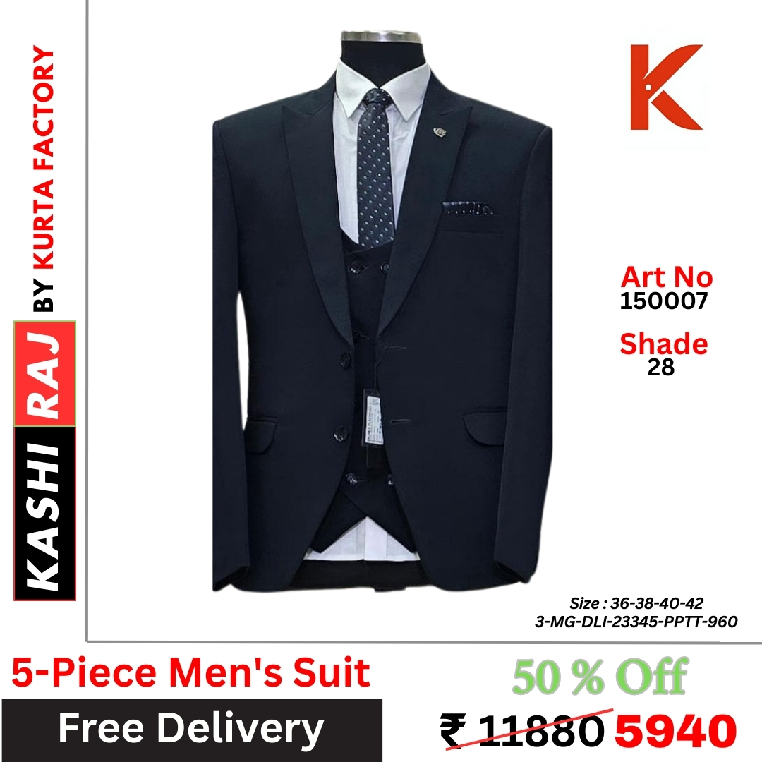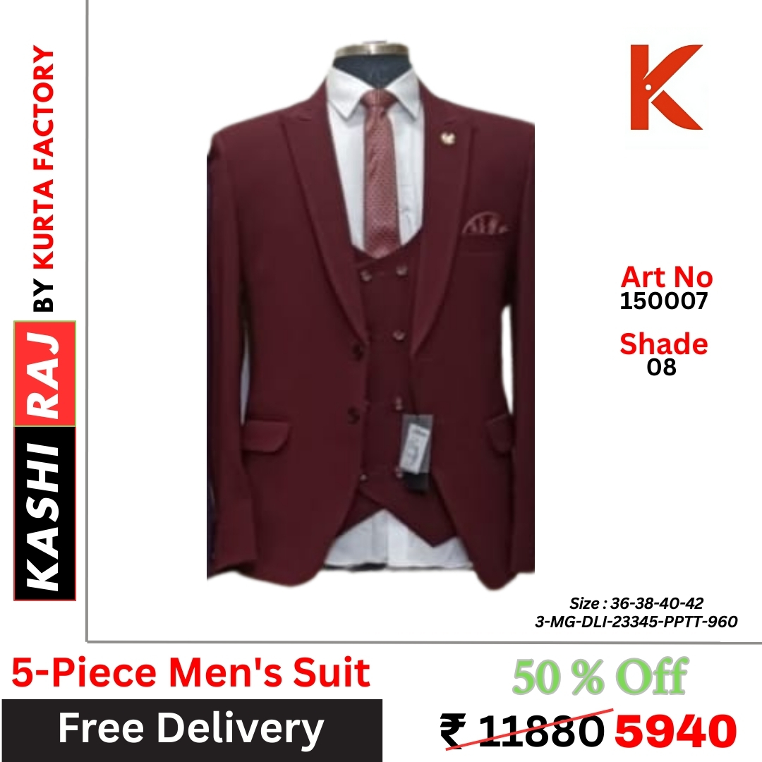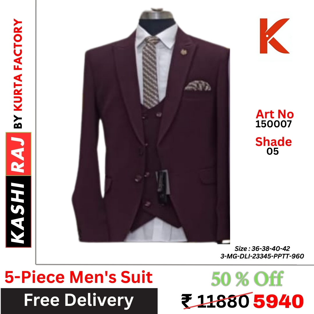 Expertly crafted for a structured yet comfortable fit, this 5-piece suit set blends modern tailoring with traditional elegance. The blazer features a clean, contoured silhouette with notched lapels and a two-button closure, while the vest adds an extra layer of polish and style. The trousers are designed with a flattering cut to offer both comfort and sleek appearance.