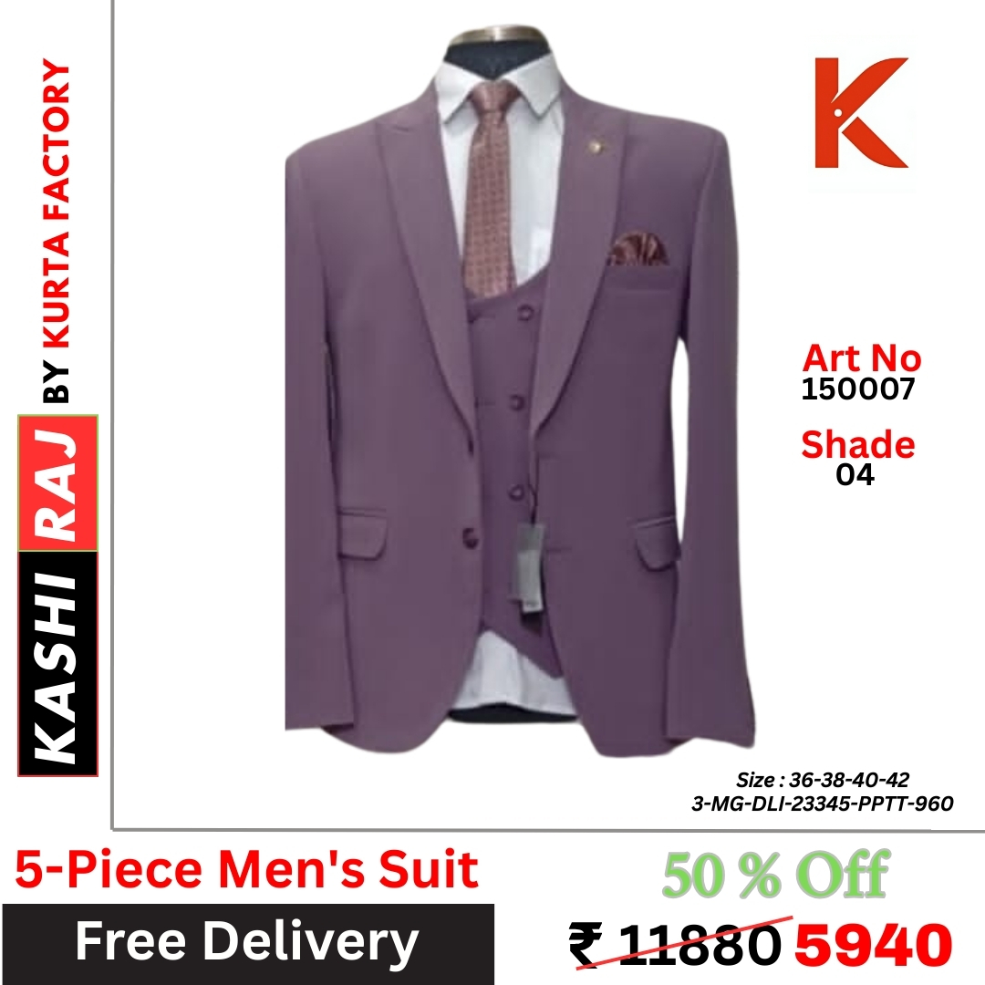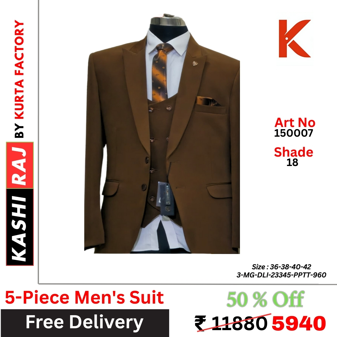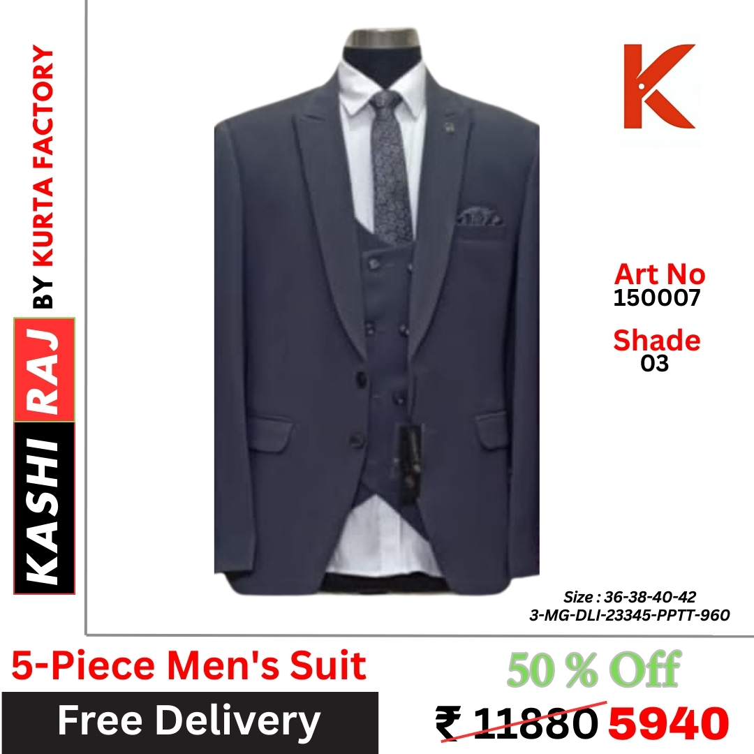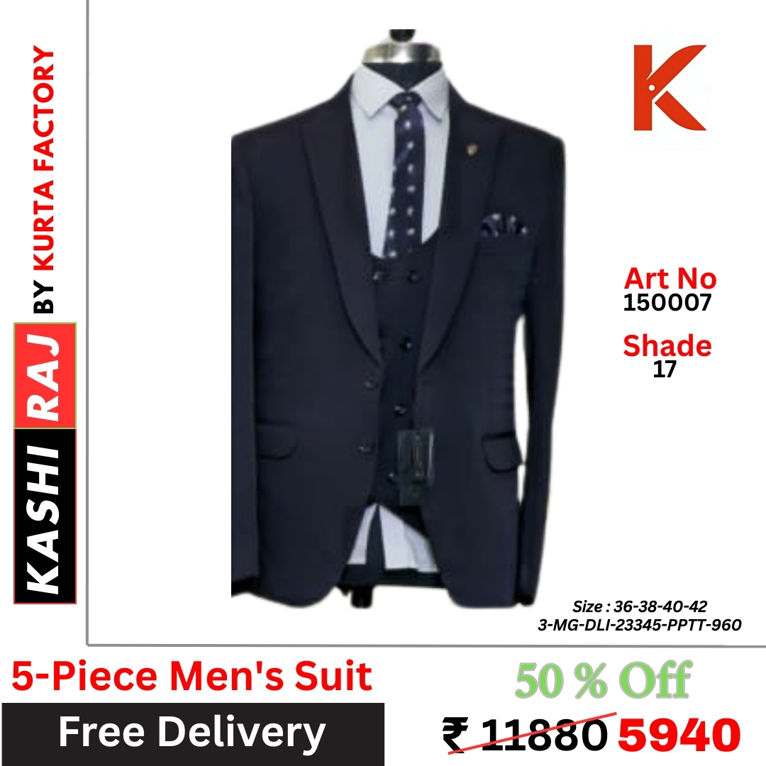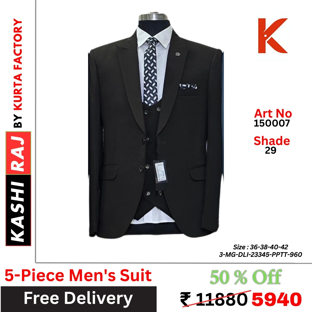Expertly crafted for a structured yet comfortable fit, this 5-piece suit set blends modern tailoring with traditional elegance. The blazer features a clean, contoured silhouette with notched lapels and a two-button closure, while the vest adds an extra layer of polish and style. The trousers are designed with a flattering cut to offer both comfort and sleek appearance.