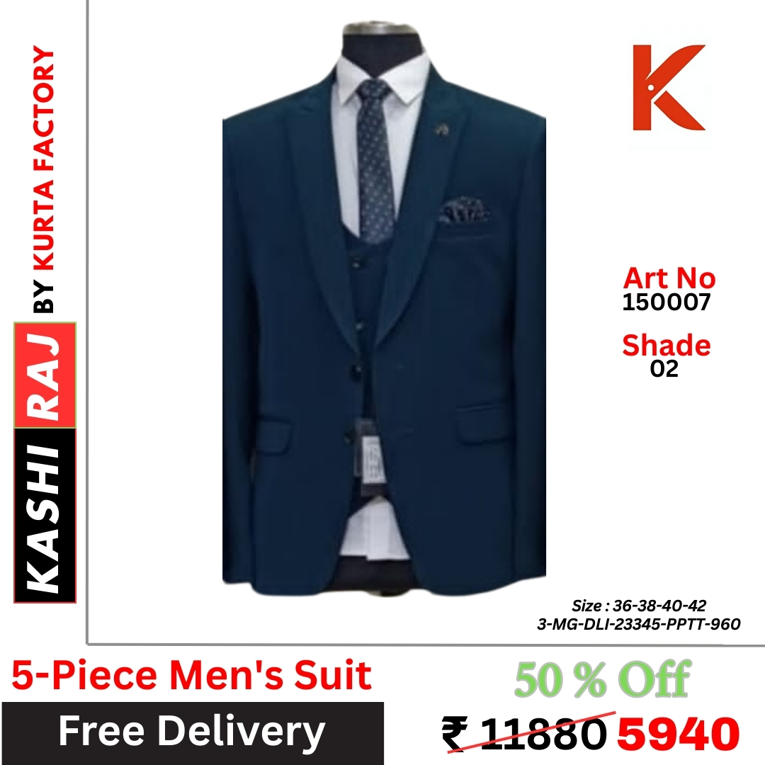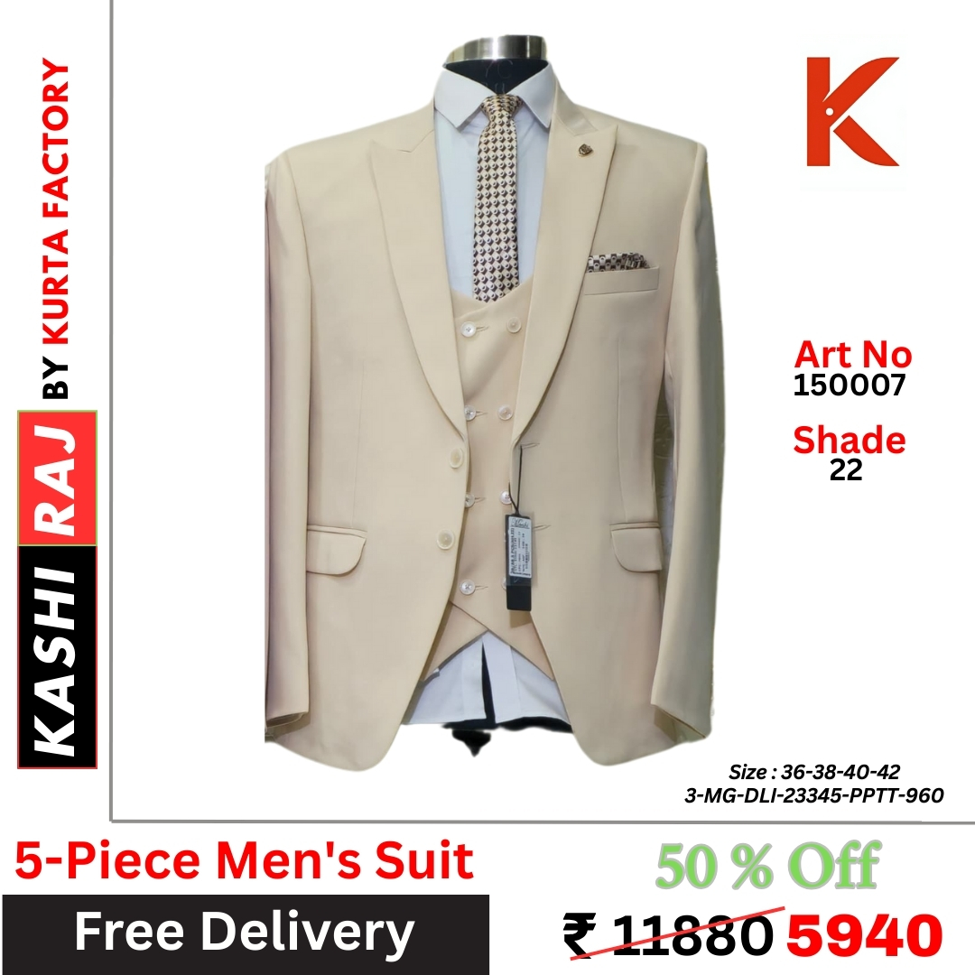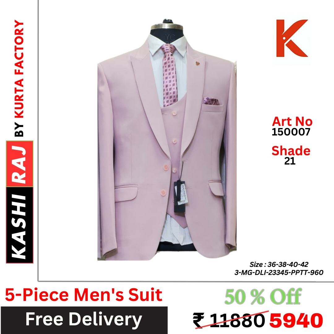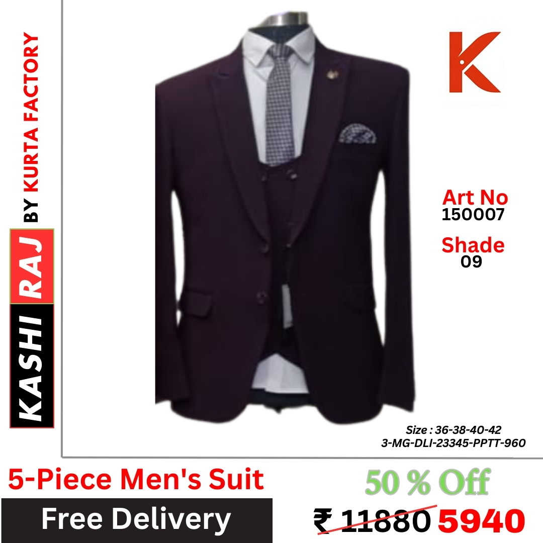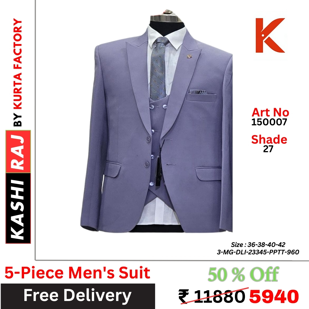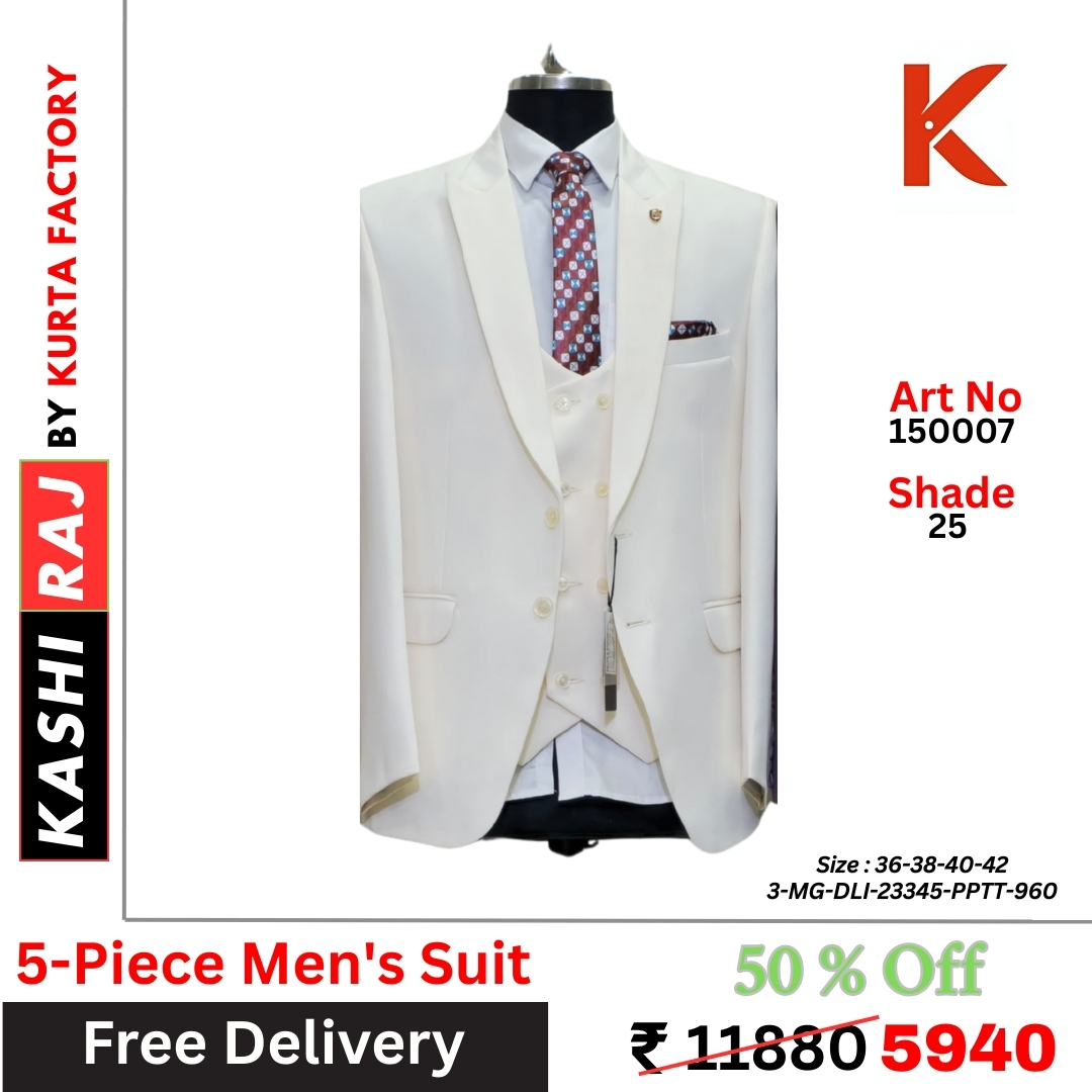 Expertly crafted for a structured yet comfortable fit, this 5-piece suit set blends modern tailoring with traditional elegance. The blazer features a clean, contoured silhouette with notched lapels and a two-button closure, while the vest adds an extra layer of polish and style. The trousers are designed with a flattering cut to offer both comfort and sleek appearance.