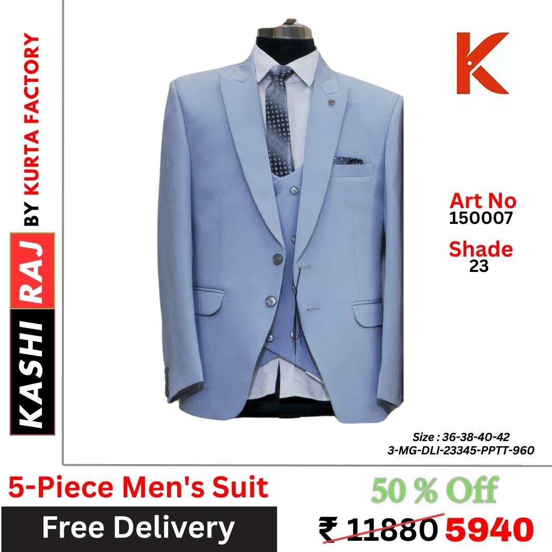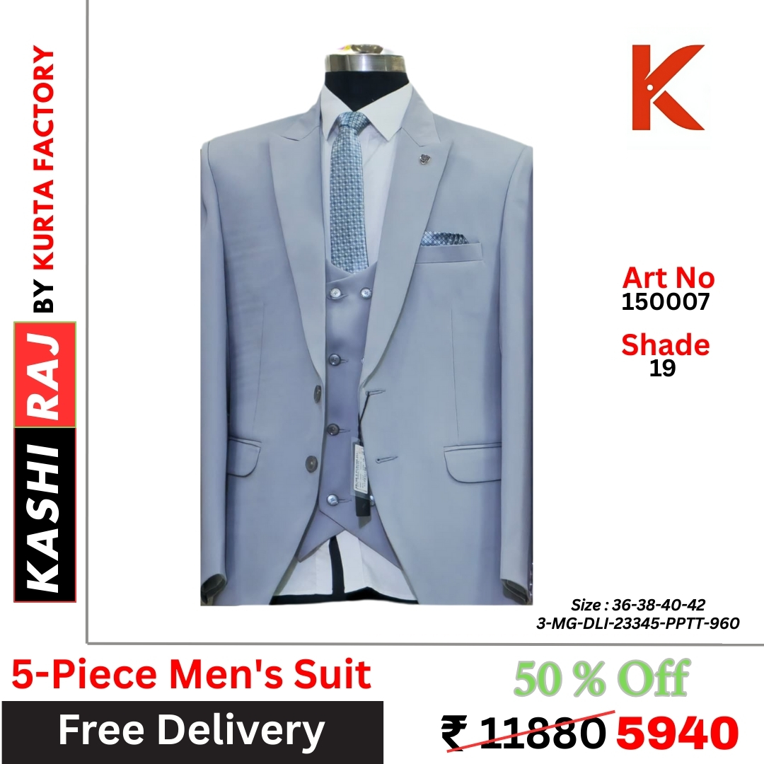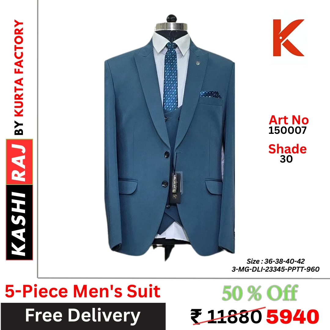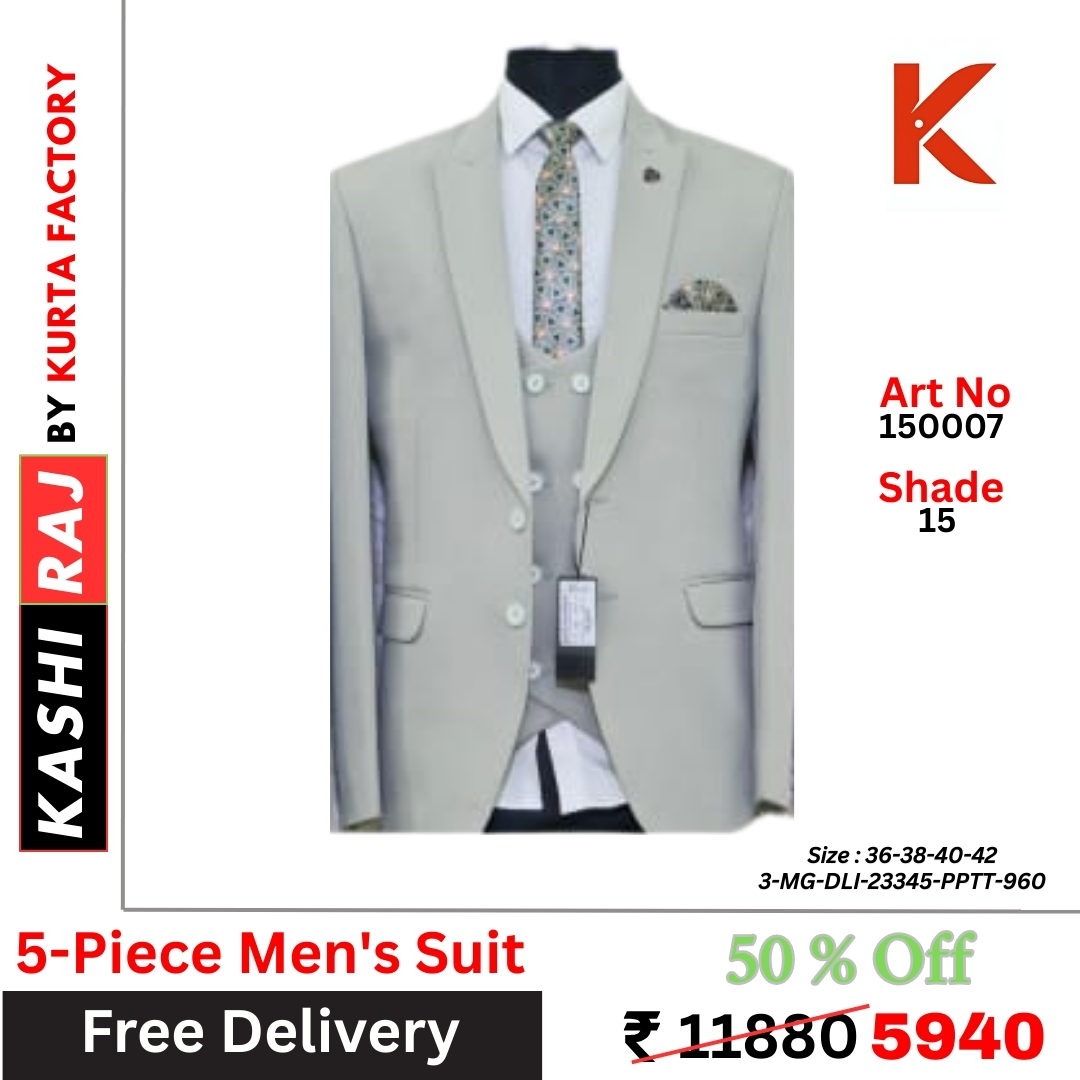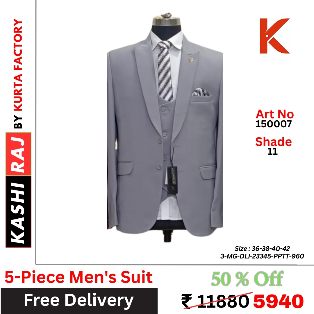 Expertly crafted for a structured yet comfortable fit, this 5-piece suit set blends modern tailoring with traditional elegance. The blazer features a clean, contoured silhouette with notched lapels and a two-button closure, while the vest adds an extra layer of polish and style. The trousers are designed with a flattering cut to offer both comfort and sleek appearance.